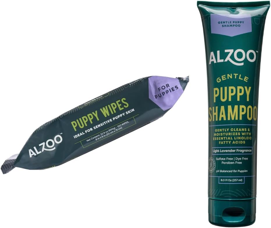 ALZOO Puppy Bundle, Grooming Wipes and Gentle Puppy Shampoo, 100% Plant-Based Active Ingredients, Made in USA