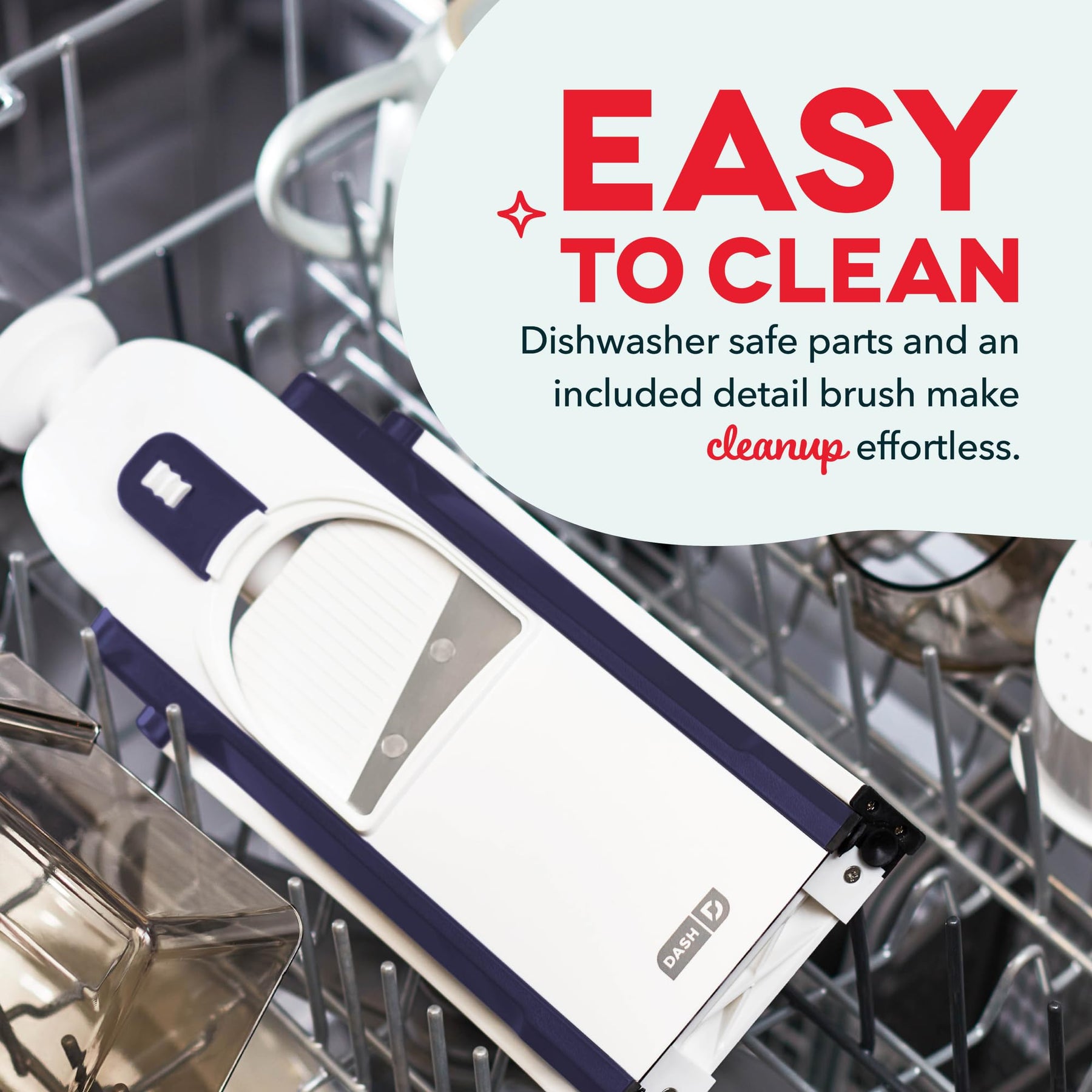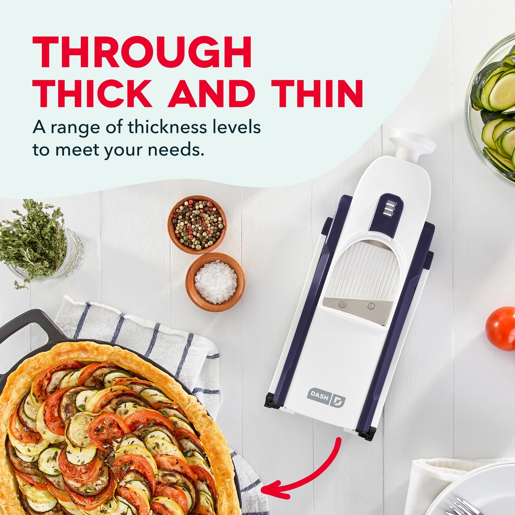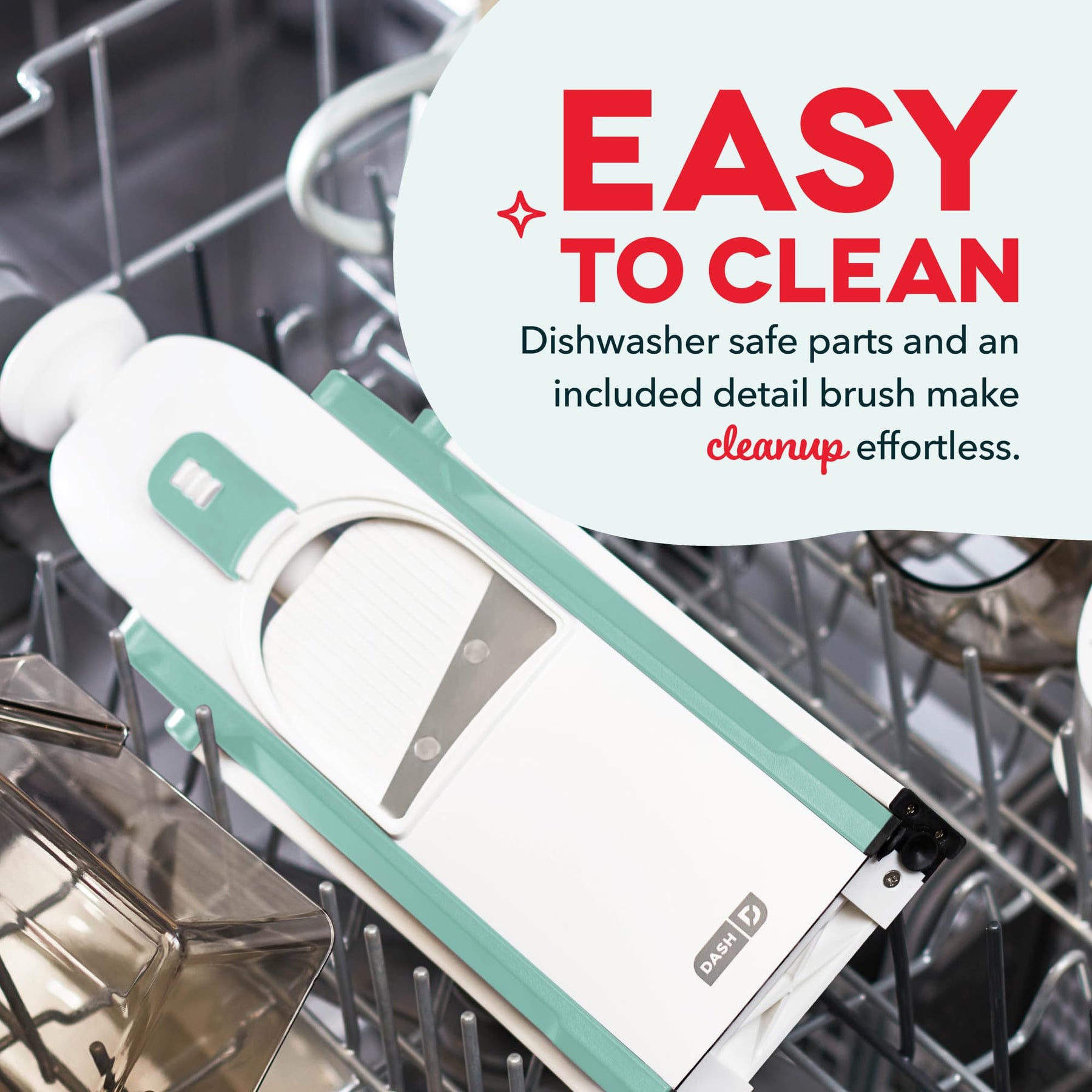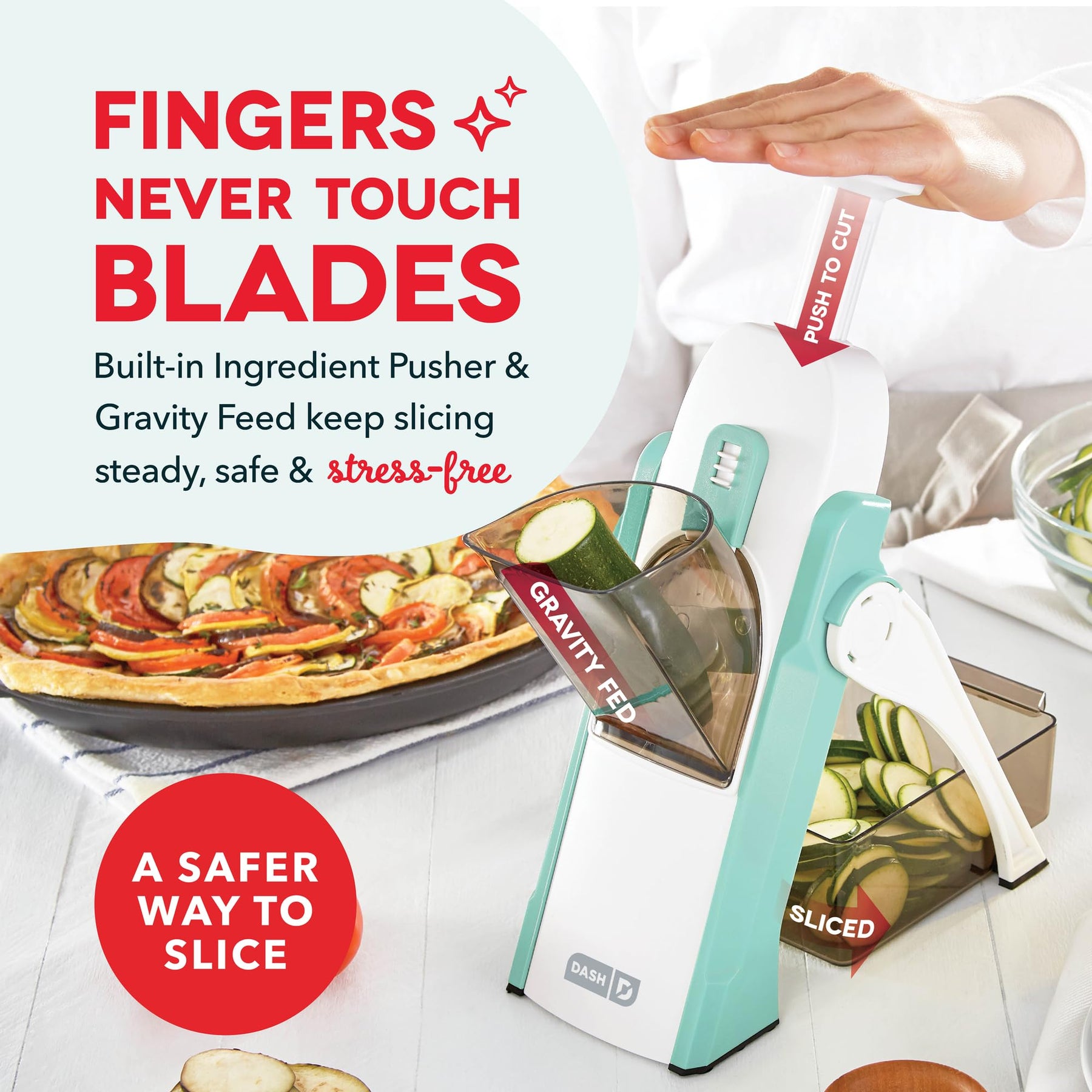 The DASH safe slice mandolin offers a safer way to cut like a Pro. The unique design prevents your Hands from ever going near the built-in blades, making this mandolin the safest option for an Expert slice. With 30+ slicing options, The mandolin cuts perfectly-even slices from 1-8mm in thickness while also offering julienne, matchstick and dicing options. Complete with a recipe guide with dishes including coleslaw or potato chips, The safe slice mandolin makes food prep quick and easy.