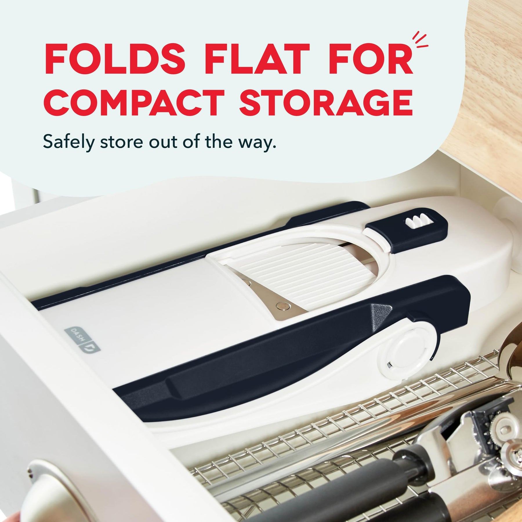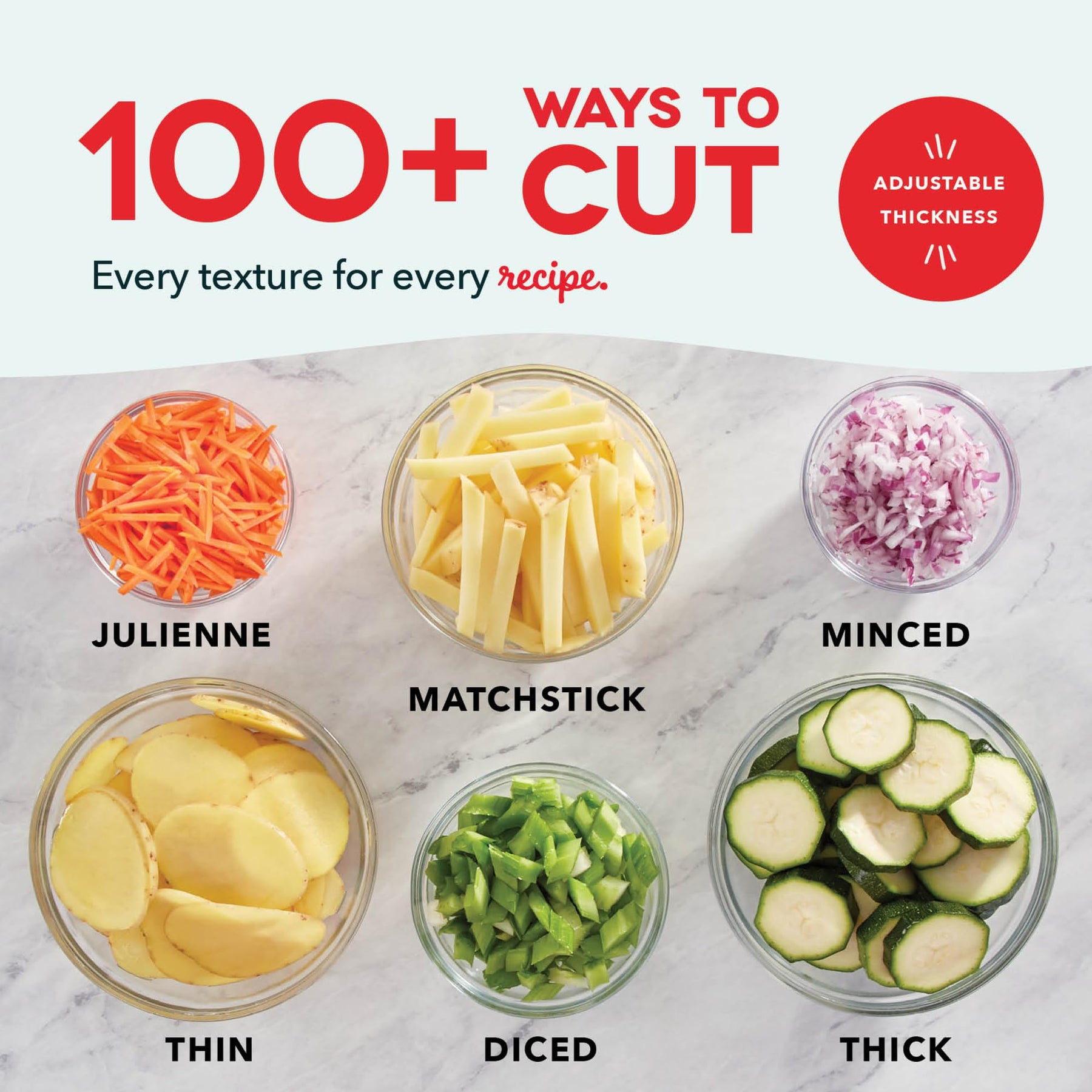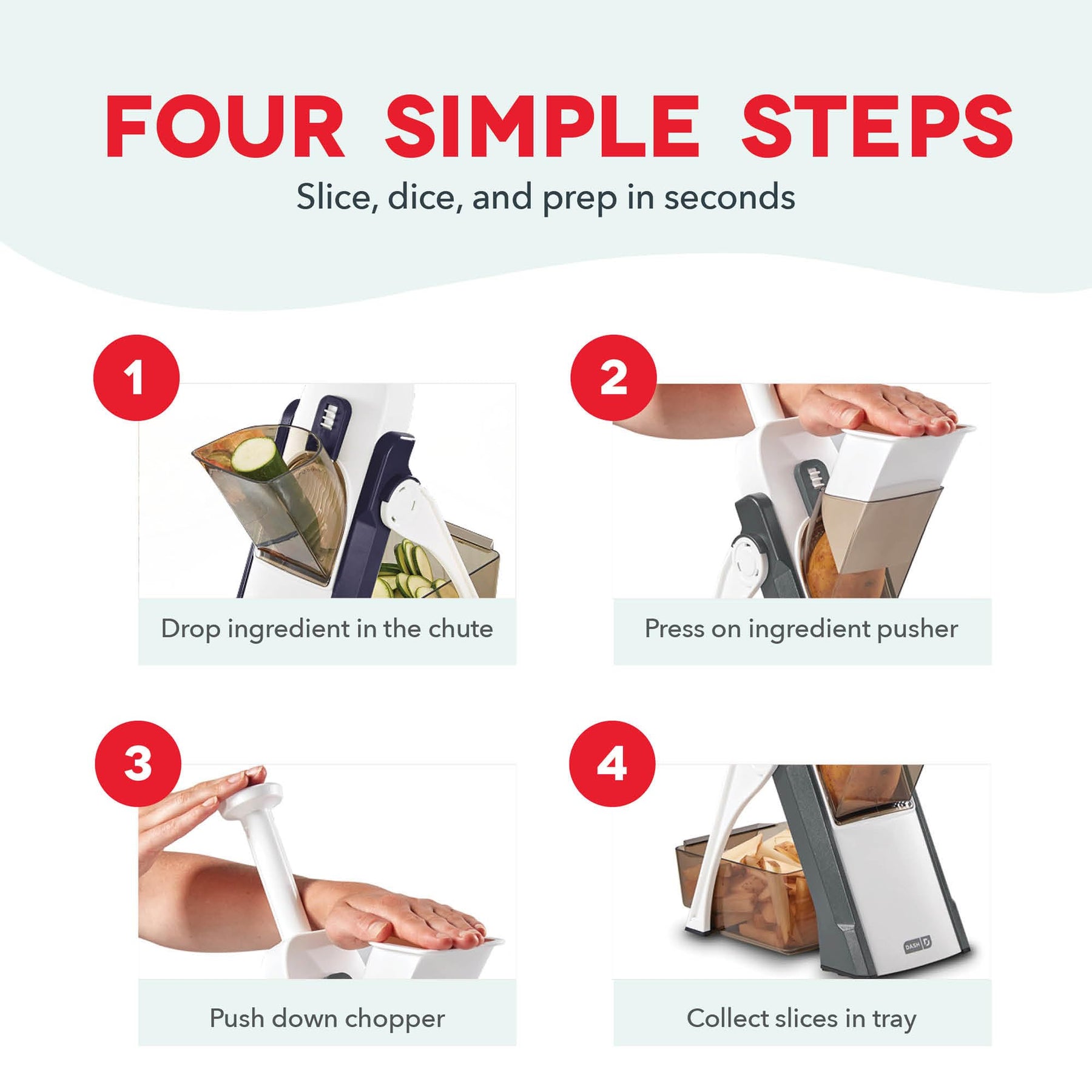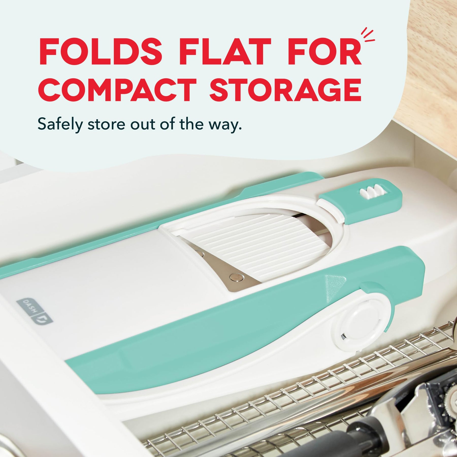 The DASH safe slice mandolin offers a safer way to cut like a Pro. The unique design prevents your Hands from ever going near the built-in blades, making this mandolin the safest option for an Expert slice. With 30+ slicing options, The mandolin cuts perfectly-even slices from 1-8mm in thickness while also offering julienne, matchstick and dicing options. Complete with a recipe guide with dishes including coleslaw or potato chips, The safe slice mandolin makes food prep quick and easy.
