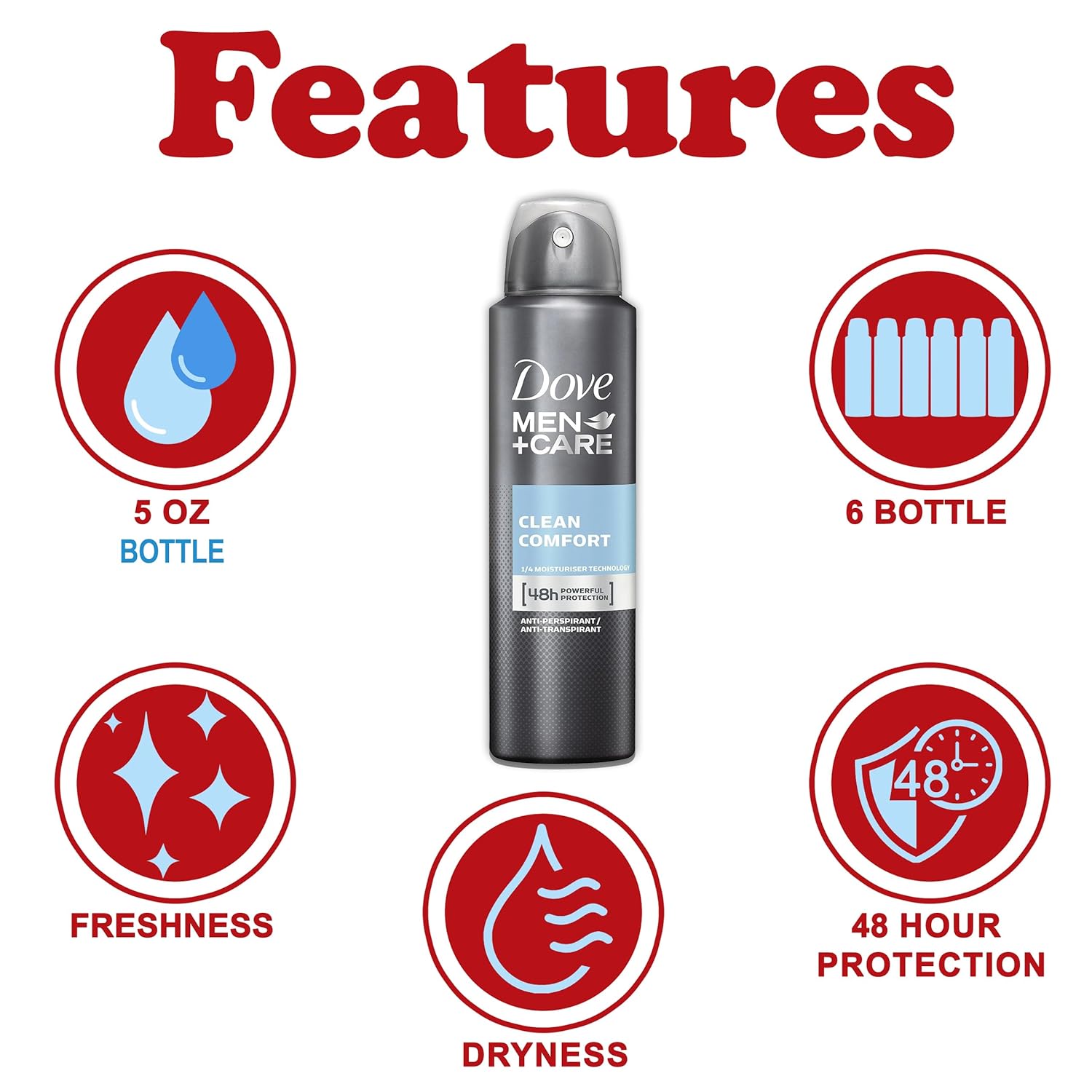 Dove Men + Care Antiperspirant Deodorant Spray, 6 Pack, 48H Protection, Long-Lasting Clean Comfort Scent, Soothes & Moisturises Skin, 5 oz. Each
