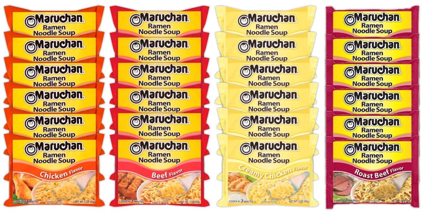 Maruchan Ramen Instant Noodle Soup Variety Mix 24 Packs, 4 Flavors - 6 Pack Chicken, 6 Pack Beef, 6 Pack Creamy Chicken , 6 Pack Roast Beef Lunch / Dinner Variety