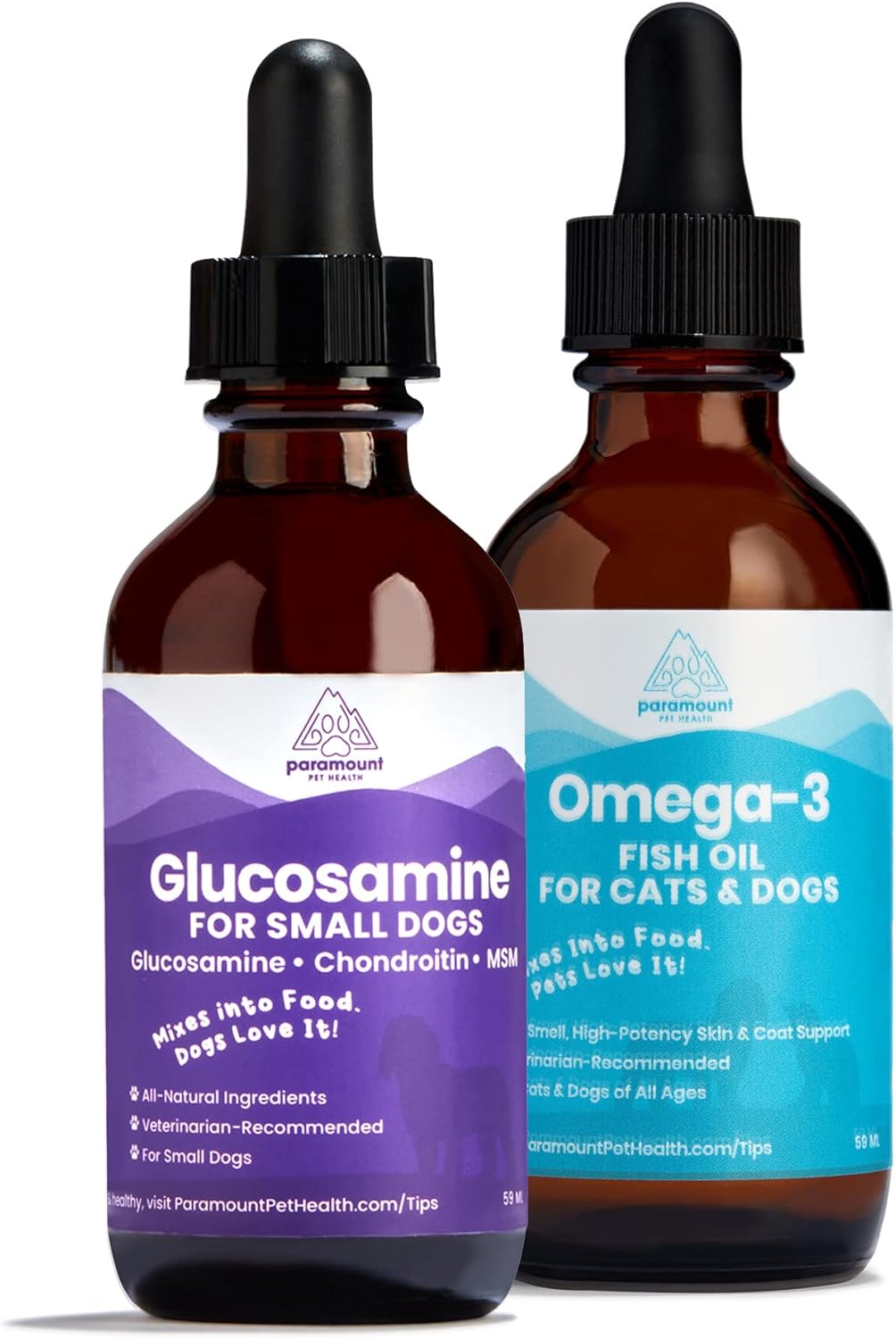 This bundle includes Liquid Glucosamine for Small Dogs (organic beef flavor) and Omega-3 Fish Oil for Small Dogs (low-odor fish flavor).