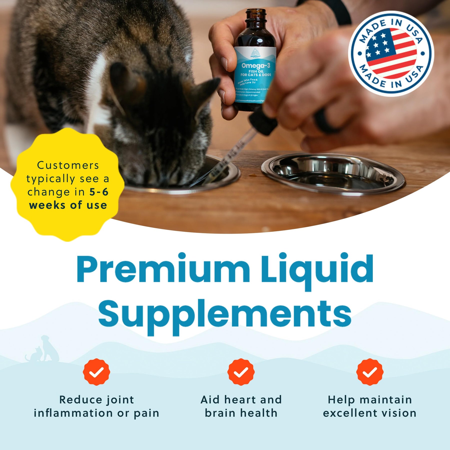 Wild-Caught Omega 3 Fish Oil for Dogs & Cats, Liquid EPA DHA Supplement for Skin, Coat, Joints & Heart, Low-Odor Omega 3 Drops for Small Dog Breeds & Cats with Itchy Skin, 2 oz
