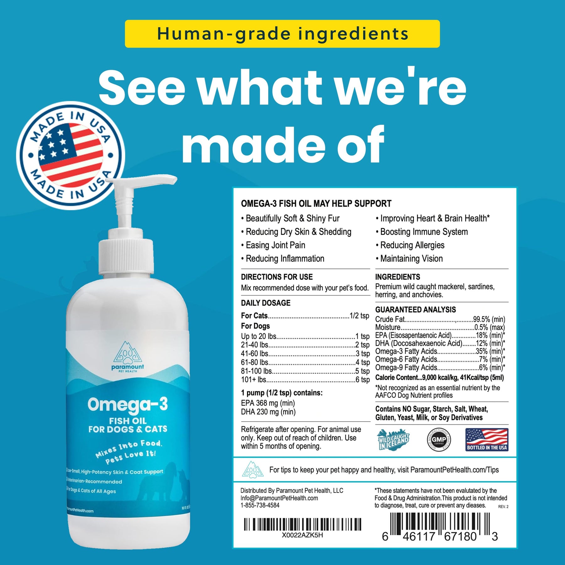 Easy to Use: Paramount Pet Health liquid omega 3 for dogs and cats is a high-potency, low-odor liquid that blends effortlessly into wet or dry food; evaluated for purity and safety so even picky pets can enjoy every drop